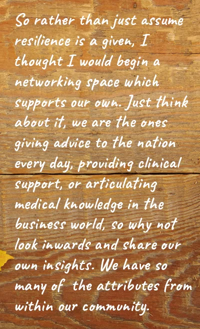So rather than just assume resilience is a given, I thought I would begin a networking space which supports our own. Just think about it, we are the ones giving advice to the nation every day, providing clinical support, or articulating medical knowledge in the business world, so why not look inwards and share our own insights. We have so many of the attributes from within our community.