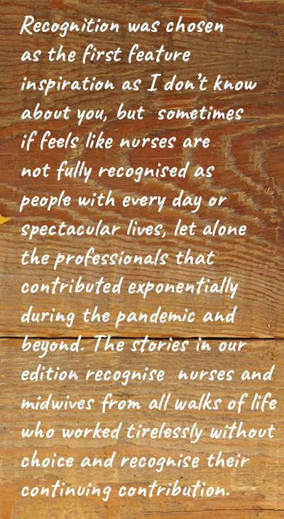 Recognition was chosen as the first feature inspiration as I don’t know about you, but sometimes if feels like nurses are not fully recognised as people with every day or spectacular lives, let alone the professionals that contributed exponentially during the pandemic and beyond. The stories in our edition recognise nurses and midwives from all walks of life who worked tirelessly without choice and recognise their continuing contribution.