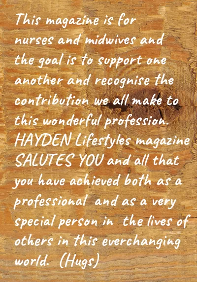 This magazine is for nurses and midwives and the goal is to support one another and recognise the contribution we all make to this wonderful profession. HAYDEN Lifestyles magazine SALUTES YOU and all that you have achieved both as a professional and as a very special person in the lives of others in this everchanging world. (Hugs)