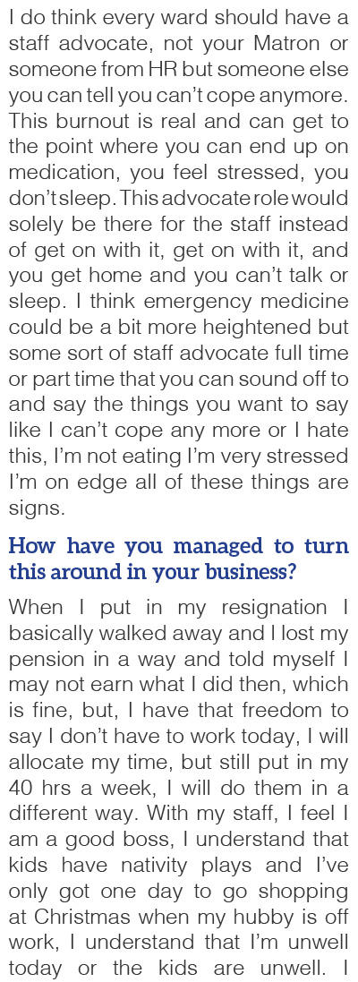 I do think every ward should have a staff advocate, not your Matron or someone from HR but someone else you can tell you can’t cope anymore. This burnout is real and can get to the point where you can end up on medication, you feel stressed, you don’t sleep. This advocate role would solely be there for the staff instead of get on with it, get on with it, and you get home and you can’t talk or sleep. I think emergency medicine could be a bit more heightened but some sort of staff advocate full time or part time that you can sound off to and say the things you want to say like I can’t cope any more or I hate this, I’m not eating I’m very stressed I’m on edge all of these things are signs.