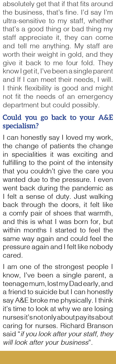 When I put in my resignation I basically walked away and l lost my pension in a way and told myself I may not earn what I did then, which is fine, but, I have that freedom to say I don’t have to work today, I will allocate my time, but still put in my 40 hrs a week, I will do them in a different way. With my staff, I feel I am a good boss, I understand that kids have nativity plays and I’ve only got one day to go shopping at Christmas when my hubby is off work, I understand that I’m unwell today or the kids are unwell. I absolutely get that if that fits around the business, that’s fine. I’d say I’m ultra-sensitive to my staff, whether that’s a good thing or bad thing my staff appreciate it, they can come and tell me anything. My staff are worth their weight in gold, and they give it back to me four fold. They know I get it, I’ve been a single parent and If I can meet their needs, I will. I think flexibility is good and might not fit the needs of an emergency department but could possibly.