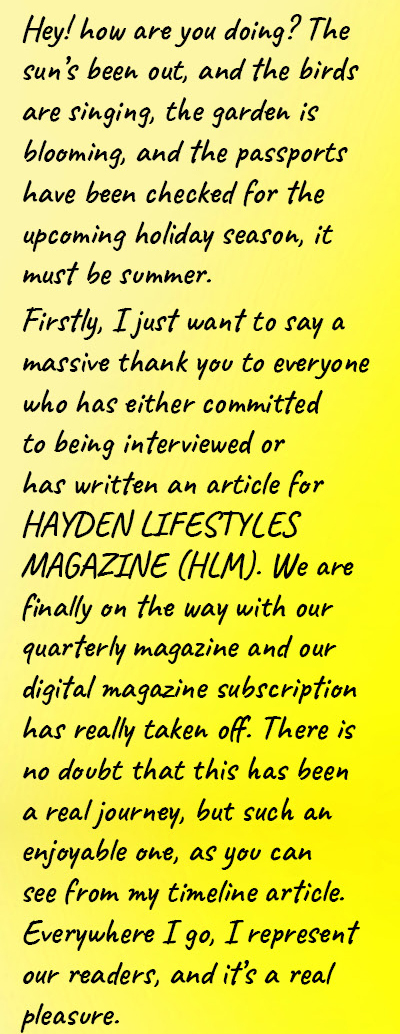 Firstly, I just want to say a massive thank you to everyone who has either committed to being interviewed or has written an article for HAYDEN LIFESTYLES MAGAZINE (HLM). We are finally on the way with our quarterly magazine and our digital magazine subscription has really taken off. There is no doubt that this has been a real journey, but such an enjoyable one, as you can see from my timeline article. Everywhere I go, I represent our readers, and it’s a real pleasure.